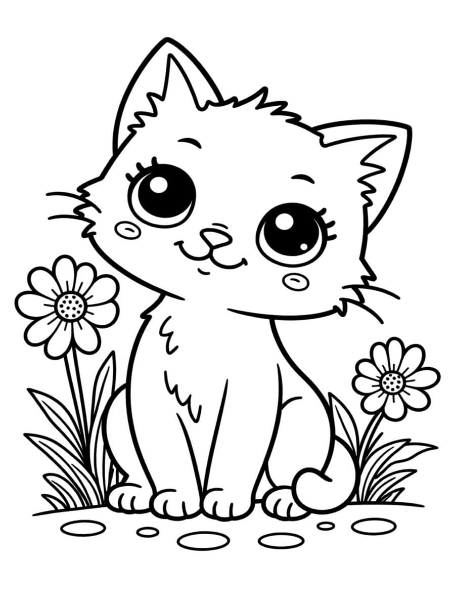 Ce coloriage met en scène un adorable chaton installé dans l’herbe, entouré de fleurs simples et expressives. Son regard attendrissant et sa posture paisible créent une ambiance printanière et rassurante. Les traits sont épais et bien définis, ce qui facilite le coloriage pour les enfants tout en offrant de belles possibilités de couleurs pour le pelage, les fleurs et le décor naturel. Un dessin parfait pour les amateurs de chats.