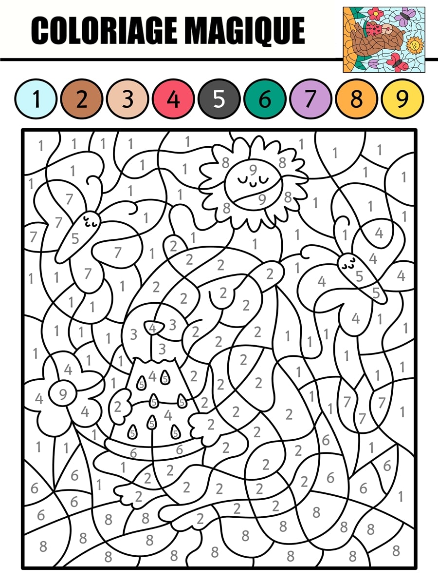 Ce coloriage magique marmotte à imprimer propose une activité ludique inspirée de la nature et des animaux de montagne. Chaque zone du dessin est associée à un chiffre et à une couleur, permettant de colorier progressivement une marmotte entourée de fleurs et de papillons. Adapté aux enfants, ce coloriage aide à reconnaître les chiffres, à suivre des consignes simples et à développer la concentration.
