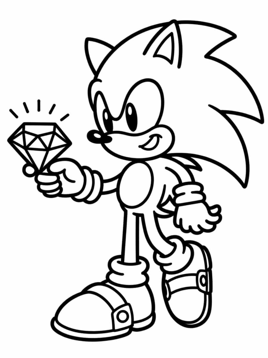 Découvrez ce coloriage de Sonic avec un diamant à imprimer gratuitement. Le célèbre hérisson est représenté en mouvement, tenant un diamant étincelant qui rappelle les objets précieux et les quêtes emblématiques de l’univers Sonic. Les contours nets et bien définis rendent ce dessin facile à colorier pour les enfants, tout en permettant de jouer avec les contrastes et les couleurs du diamant.